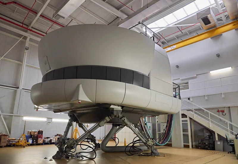 The centre has 18 different simulators, each one an exact replica of a different plane. Strange mechanical boxes suspended on hydraulic legs in a large hanger, twisting and turning by some unseen controller.