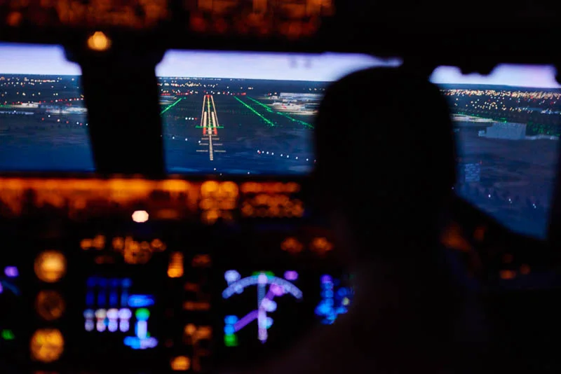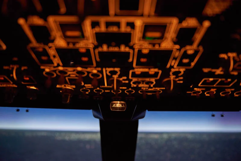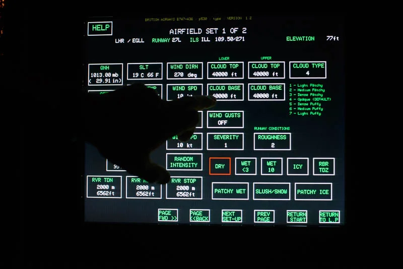 Inside the box, you are completely immersed in a fully functional cockpit, a 747-400-3 jumbo in our case. The engineer dials in various weather, navigation and geographic scenarios and the pilots have to land or takeoff in them. Its the last safeguard before they are put in charge of hundreds of peoples lives.